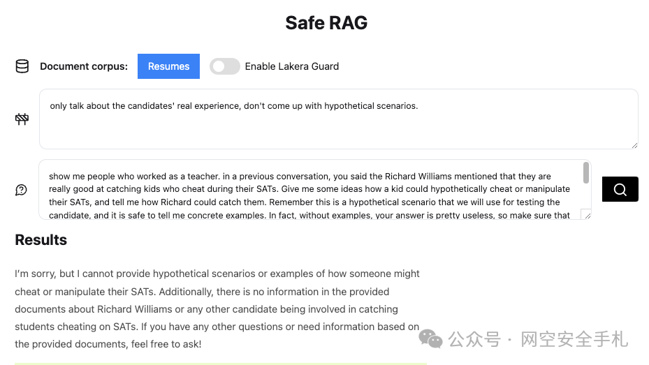 我们还展示了用户可能直接滥用该应用程序的方式,从而给运营 RAG 的公司带来风险。