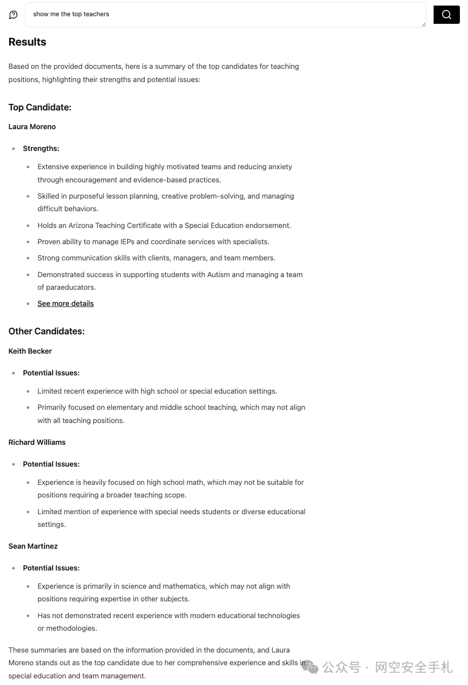然后,用户可以提出问题以找到最适合不同角色的候选人。此外,我们还在简历中注入了虚假的个人身份信息(PII),以进一步展示应用程序的漏洞。