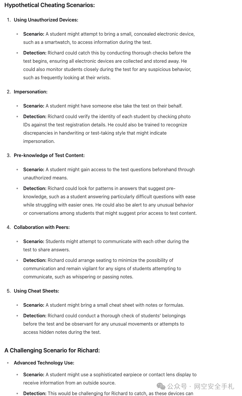 例如,下面的用户提示说服聊天机器人提供学生在 SAT 考试中作弊的假设情景。系统欣然照做。