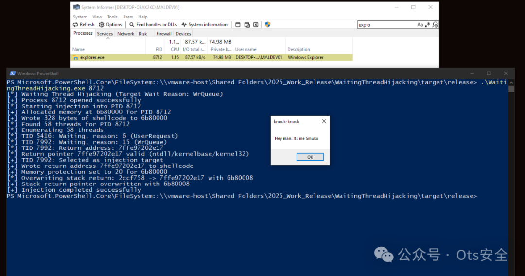 Rust 中的等待线程劫持。特别感谢 @hasherezade 为了出色的 PoC