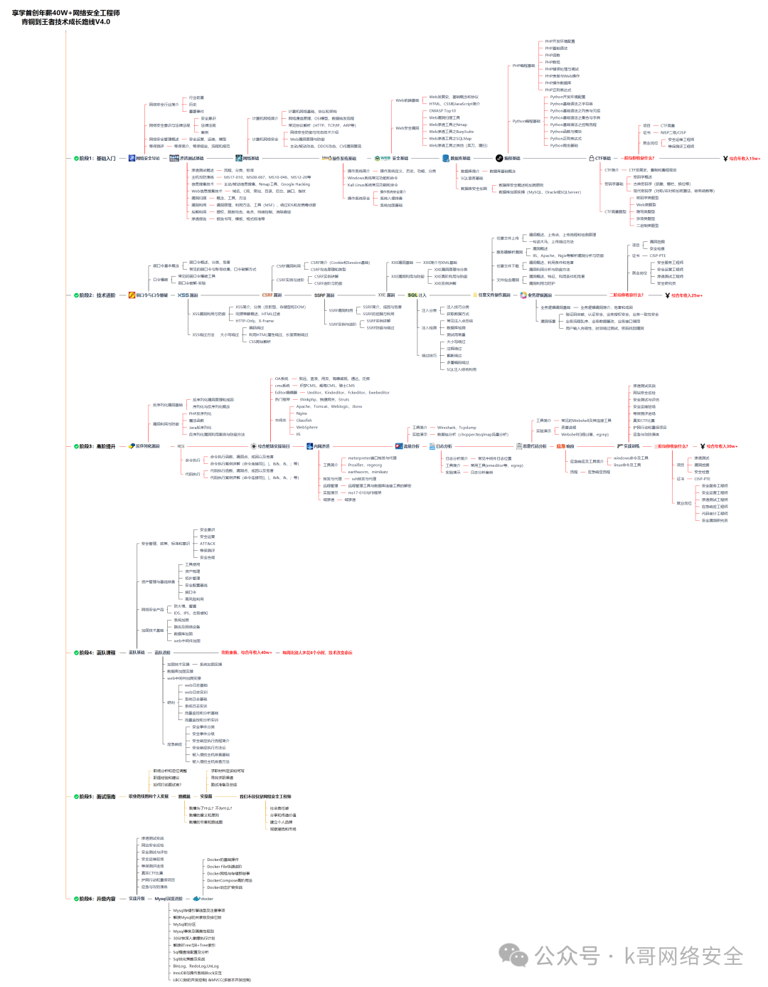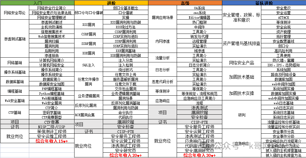 这个方向初期比较容易入门一些,掌握一些基本技术,拿起各种现成的工具就可以开黑了。不过,要想从脚本小子变成hei客大神,这个方向越往后,需要学习和掌握的东西就会越来越多,以下是学习网络安全需要走的方向: