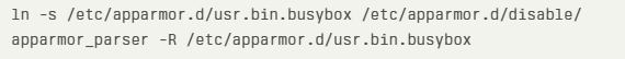 默认 Busybox shell 的 AppArmor 配置文件允许不受限制地创建命名空间。攻击者可通过 Busybox 启动 shell 并执行: