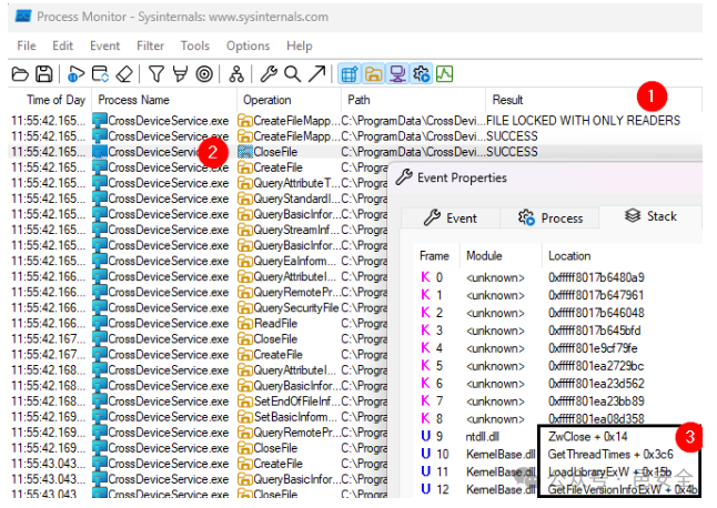 研究人员发现,位于用户可修改的 %PROGRAMDATA%\CrossDevice\ 目录中的文件CrossDevice.Streaming.Source.dll首先由常规用户进程加载,然后由高权限系统进程加载。
