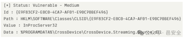该漏洞利用涉及多项技术挑战。使用 PrivescCheck 工具进行的初步自动扫描显示,非特权用户对 COM 服务器模块文件具有修改权限: