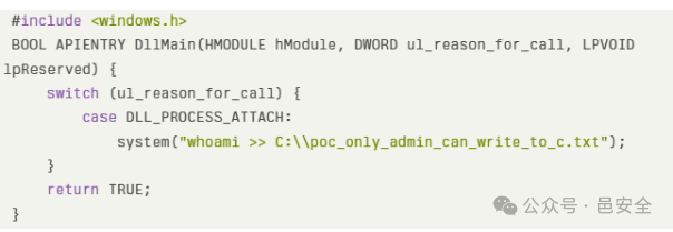 研究人员创建了一个恶意 DLL,它在添加未经授权的命令时保持预期的功能: