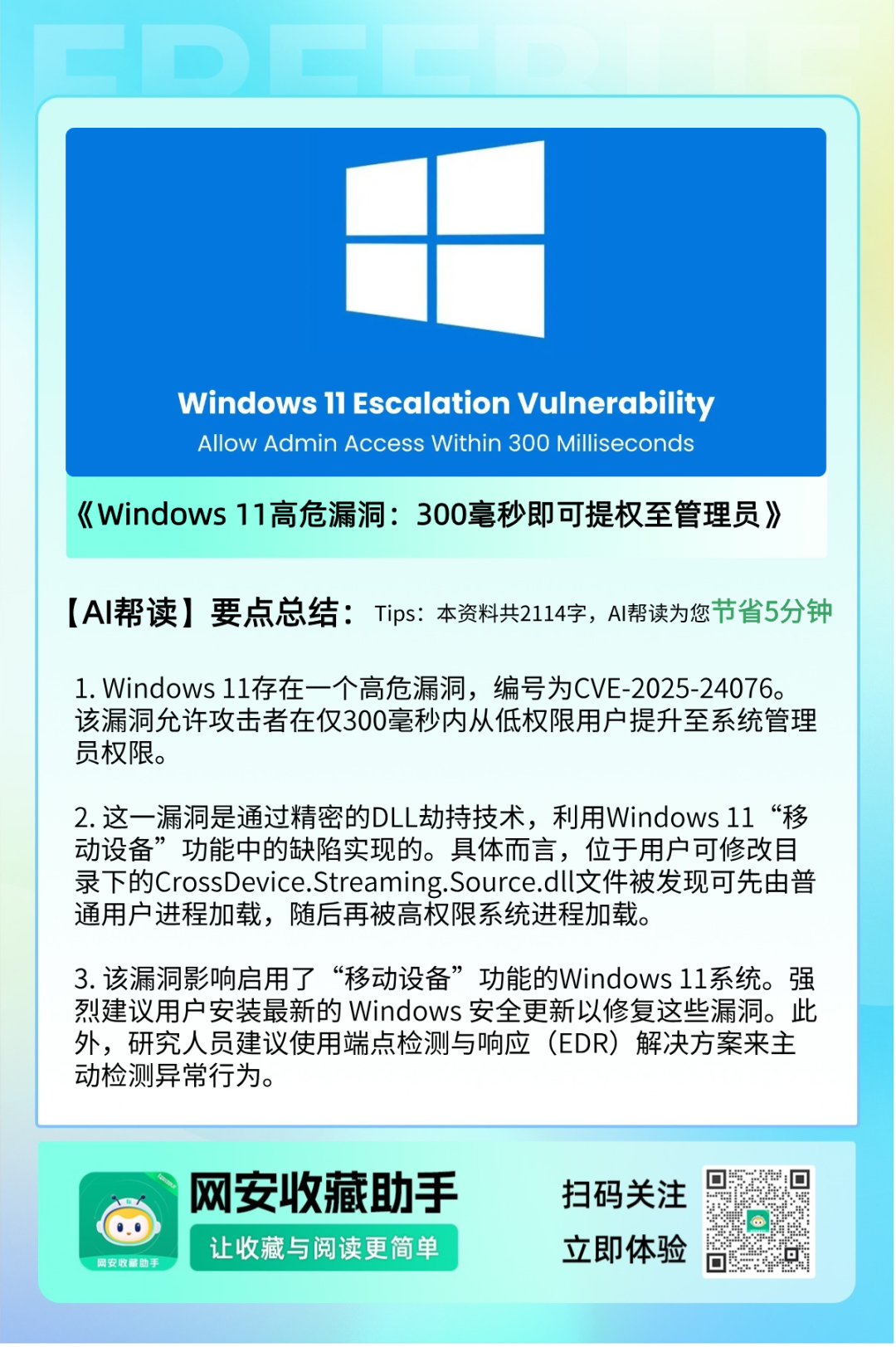 Windows 11高危漏洞:300毫秒即可提权至管理员