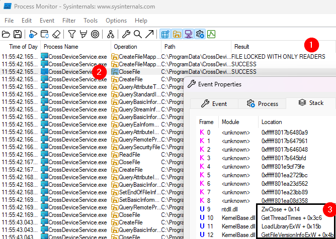 研究人员发现,位于用户可修改目录 %PROGRAMDATA%\CrossDevice\ 下的 CrossDevice.Streaming.Source.dll 文件会先由普通用户进程加载,随后被高权限系统进程加载。