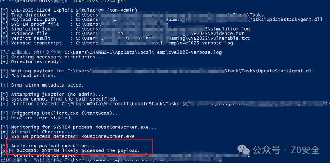 漏洞存在于Windows更新组件(如MoUsoCoreWorker.exe和UsoClient.exe)中。由于系统默认信任C:\ProgramData\Microsoft\UpdateStack\Tasks路径,攻击者可通过创建符号链接(Junction),将该路径重定向到用户可控目录,并植入恶意脚本。当系统执行更新任务时,SYSTEM权限进程会加载恶意文件,导致攻击者完全控制系统。