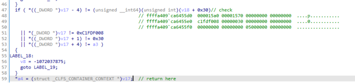 之后代码会依次检测该指针附近的几个值是否符合规定,这些检测的字段也都是trigger clfs一开始构造的部分。
