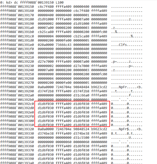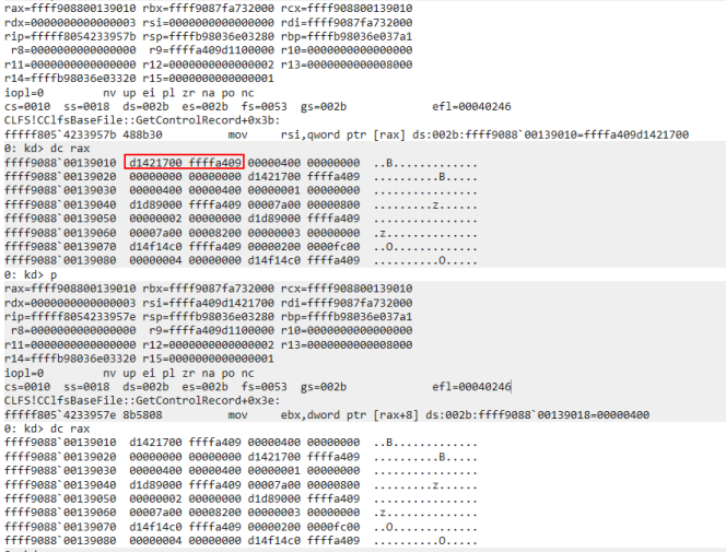 可以看到该返回的数据实际是CLFS_CONTROL_RECORD中跳过hdrControlRecord(0x70)之后的位置,该位置偏移0x10开始就是spray[i] clfs构造时设置的数据。