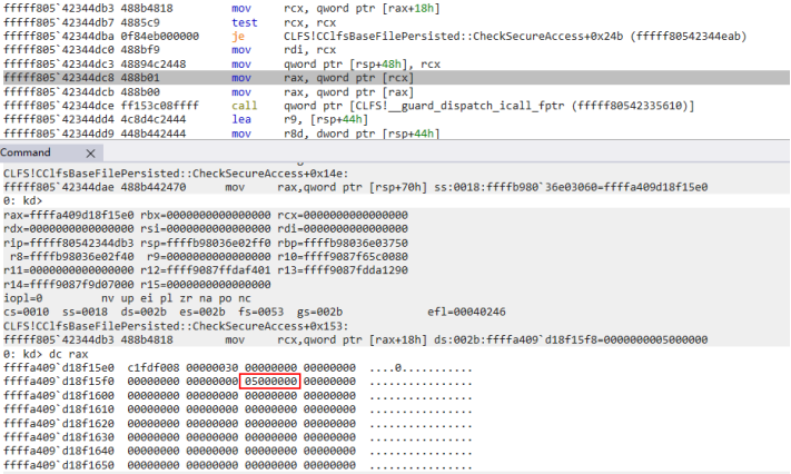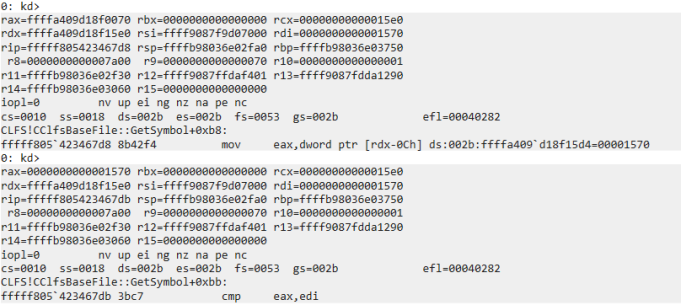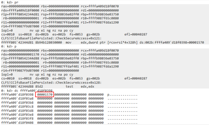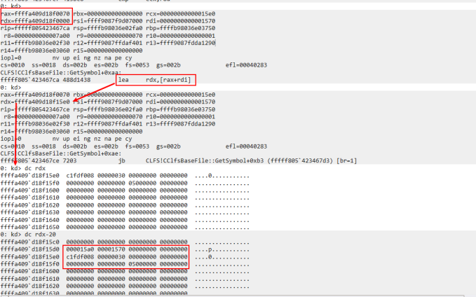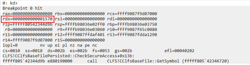 这里在CLFS!CClfsBaseFilePersisted::CheckSecureAccess下断,可以看到传入CLFS!CClfsBaseFile::GetSymbol前poi(BaseLogRecord + 0xCA)的值是0x1570。