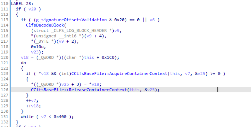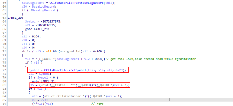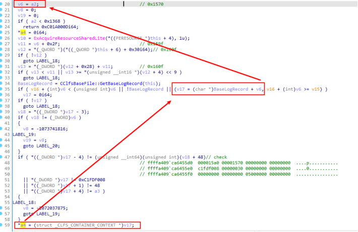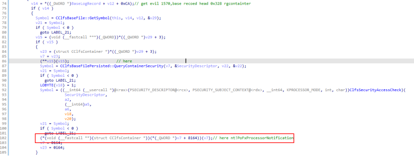 触发0x500000内存代码执行的函数为CLFS!CClfsBaseFilePersisted::CheckSecureAccess,可以看到恶意的container pointer来自v29,而v29来自于函数CLFS!CClfsBaseFile::GetSymbol。