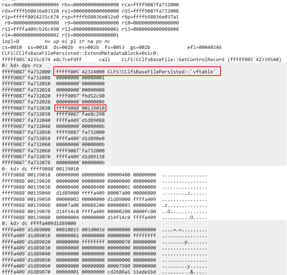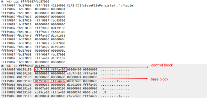 CClfsLogFcbPhysical对象0x2b0的位置指向CClfsBaseFilePersisted对象,该对象0x30的位置保存一个指针,该指针指向一段0x90大小的heap内存,这里称之为clfsheap,clfsheap 0x30保存指向base block的指针。