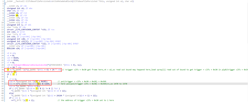 越界读取对应spray clfs[i] clfsheap结构后pipB数组中的trigger clfs + 0x30,trigger clfs 中0x58的位置被log初始化时设置为0x369,WriteMetadataBlock继续向下执行,通过越界读取的trigger clfs + 0x30,执行以下代码运算: