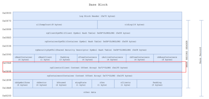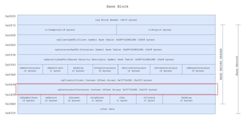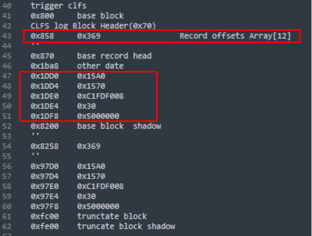 可以看到其主要是修改了CLFS log Block Header Record offsets Array[12]的位置,此外依次在base block及base block shadow的other data中修改了16个字节的数据,这里注意base block及base block shadow一致。