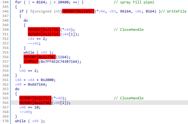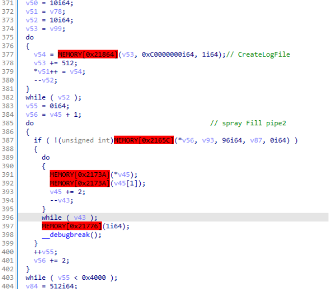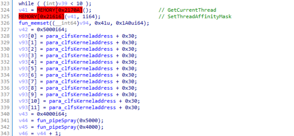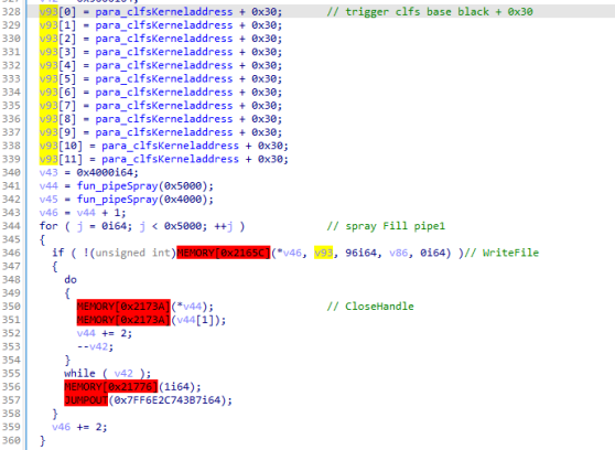 之后,代码进行了一系列内存spray的操作。首先trigger clfs 对应的内核base block内核地址+0x30的位置被循环赋值到一个数组v93中,然后两次调用函数fun_pipeSpray,对应的参数分别为0x5000及0x4000。