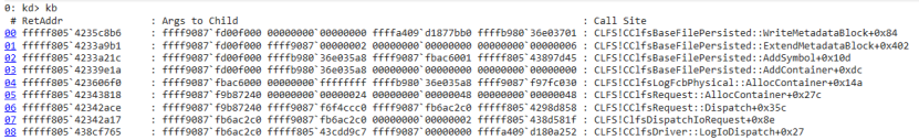 针对函数CLFS!ClfsEarlierLsn下断点,CreatelogFile函数调用完毕之后,内核中触发进入了CLFS!ClfsEarlierLsn调用。