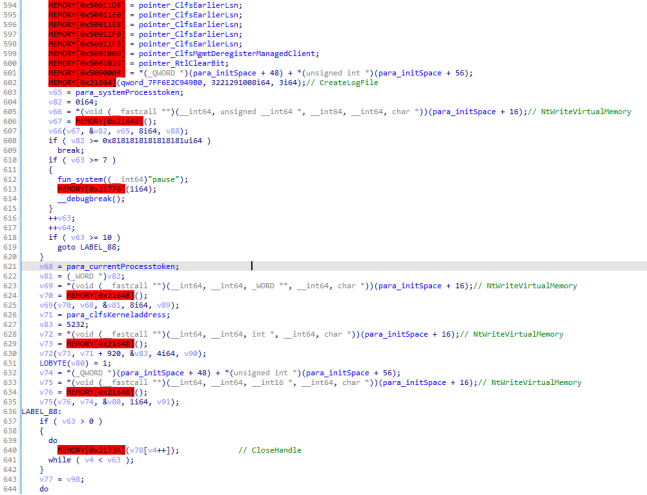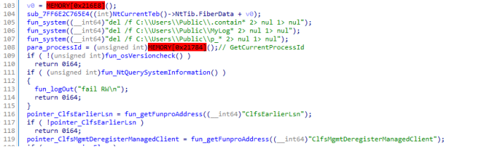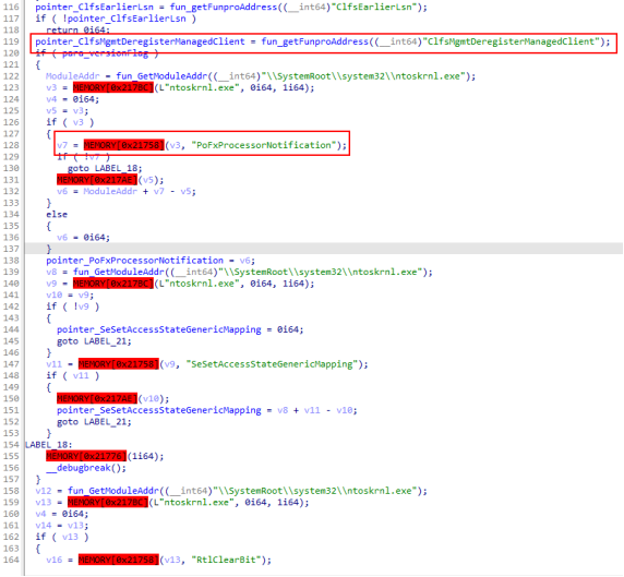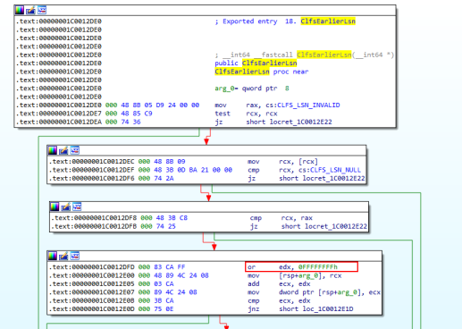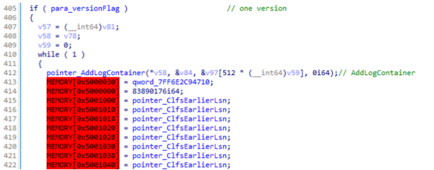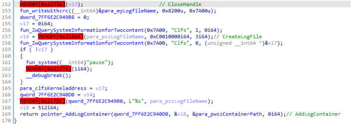 通过动态地址获取的方式分别从clfs.sys/ntoskrnl.exe中获取函数ClfsEarlierLsn,ClfsMgmtD