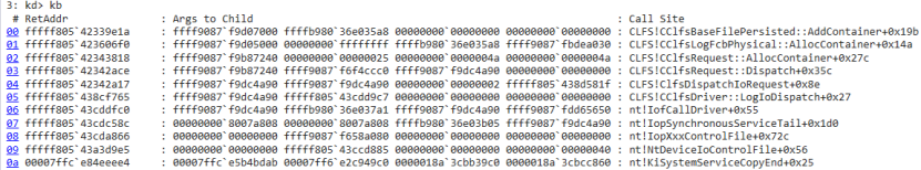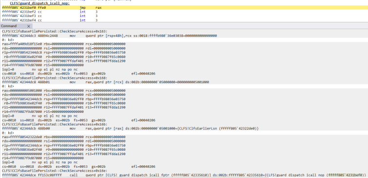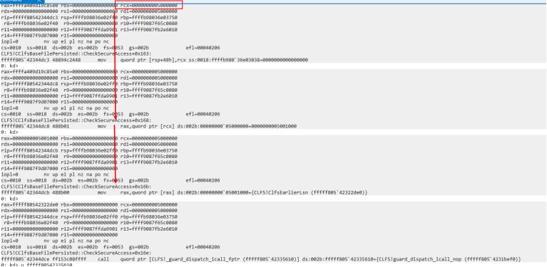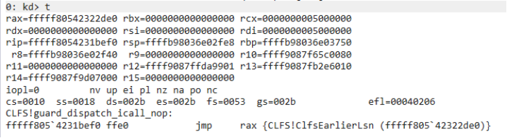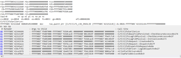 第一步需要确认我们的猜测是否正确,即是否是调用了错误的container pointer,该pointer指向0x500000,这里最简单的方法就是针对CLFS!ClfsEarlierLsn下断点,因为该函数是0x500000这段内存函数调用链的开始,通过它可以找到漏洞触发时是如何进入到该地址执行的。