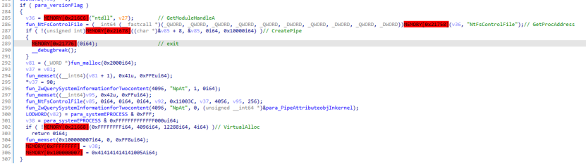 接下来获取NtFsControlFile函数地址,并通过ZwQuerySystimeInformation获取PipeAttributer的内核对象地址,在0xFFFFFFFF上分配长度为4096的内存,并以此部署system Process token,熟悉CVCE-2022-37969利用的话就知道这个位置使用于辅助ClfsEarlierLsn/SeSetAccessStateGenericMapping进行最终的内存写入。