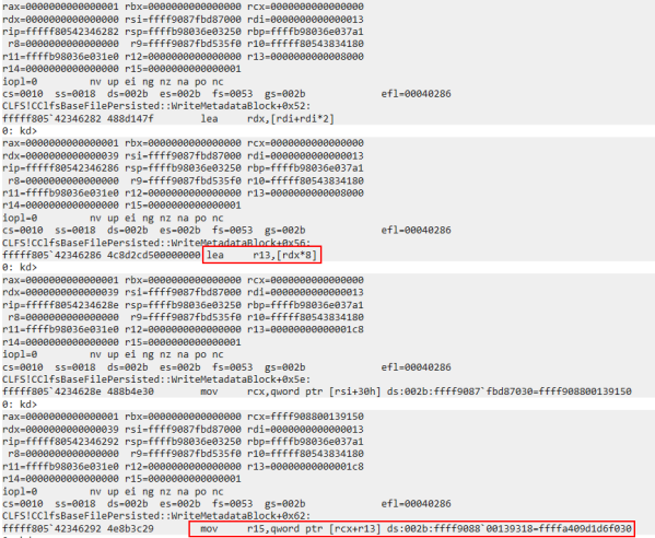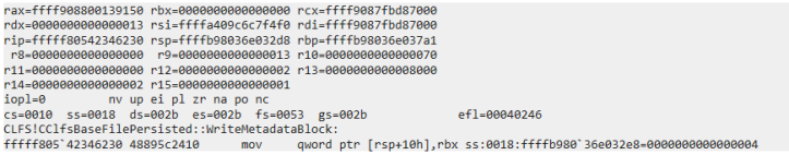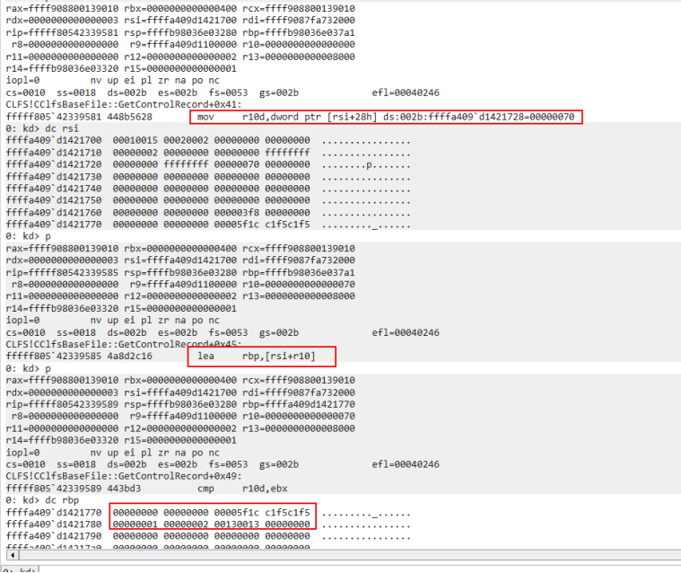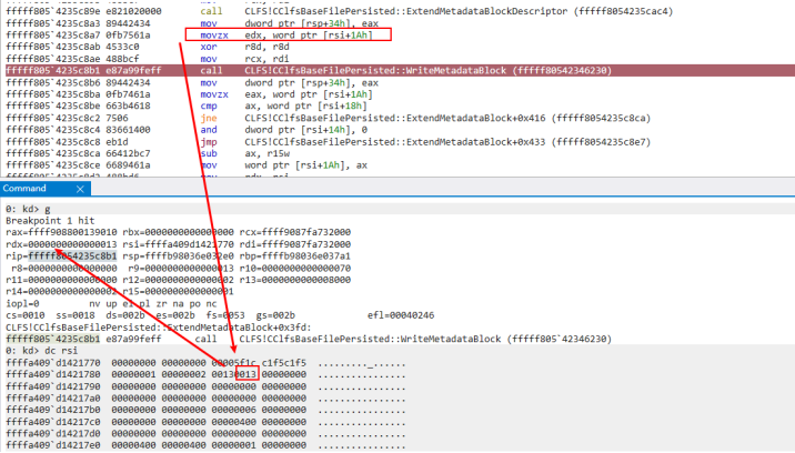 继续向下执行到CClfsBaseFilePersisted::WriteMetadataBlock,此时通过返回的指针寻址到0x1a处的数据,正好就是spray[i] clfs中构造的数据0x13,对应上文CLFS_CONTROL_RECORD结构, 这里ullMagicValue固定为0xc1f5c1f500005f1c,因此这个位置应是iFlushBlock。