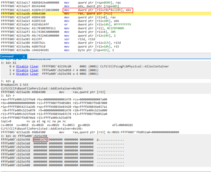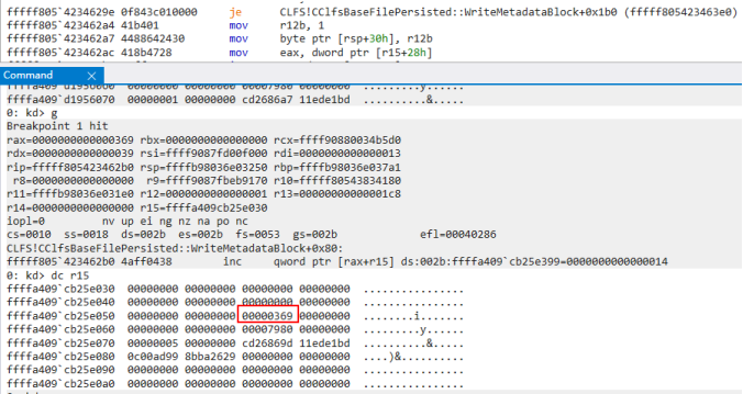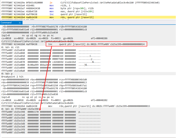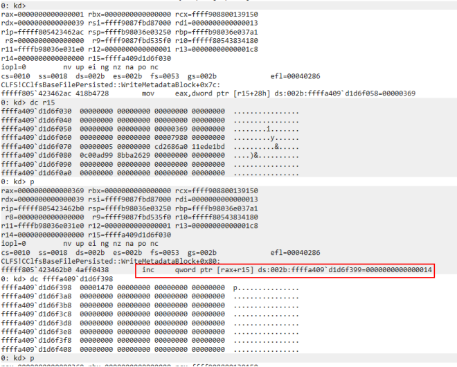 紧接着0x369+r15(该值为trigger clfs base block + 0x30),并将该处的数据++,从而触发之前配置的写断点,即将trigger clfs base block 0x398处的0x1470成功修改为0x1570。