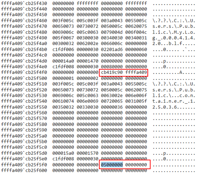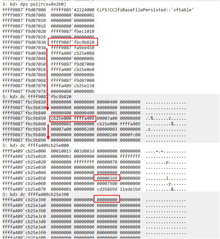 这里需要遍历到符合触发结构的spray[i],此时该spray[i]对应的CClfsBaseFilePersisted地址为ffff9087fbd87000。