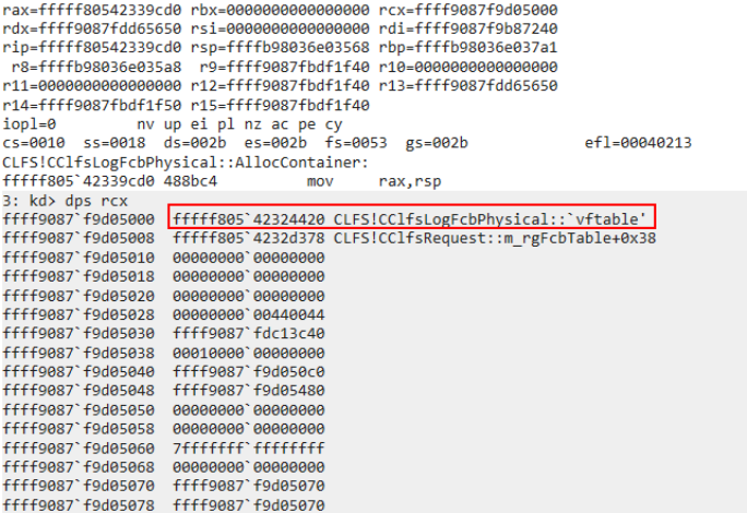 Exp中调用AddLogContainer,对应内核中的函数为CLFS!CClfsLogFcbPhysical::AllocContainer,该函数的this指针指向对象CClfsLogFcbPhysical