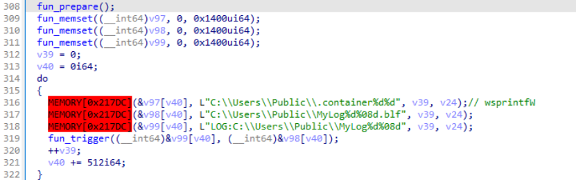 进入该exp 的核心部分,函数fun_prepare中通过CreateLogFile创建第一个log file,这里称之为trigger clfs,之后循环调用fun_trigger再次创建10个log file,这里称之为spray clfs[i]