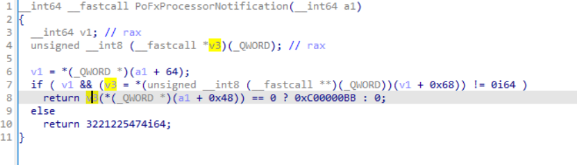 该利用不像之前CVE-2022-36979简单直接通过ClfsEarlierLsn/SeSetAccessStateGenericMap的组合进行调用,而是在这之间还插入两个函数。首先是PoFxProcessorNotification,该函数会以第一个参数偏移0x68位置为函数指针,偏移0x48为参数进行调用。