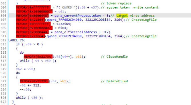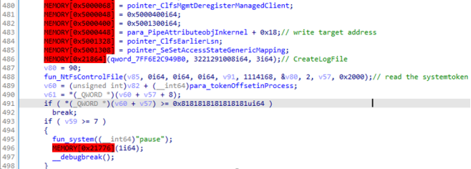 完成0x5000000的内存布局后,调用CreateLogFile,此时调用的clfs对象是trigger clfs,CreateLogFile调用完成即可通过fun_NtFsControlFile读取system process的token,从这里就可以看到CreateLogFile调用之后应该就触发了漏洞,完成了和之前CVE-2022-36979一样的操作,即执行了内存0x50000000中的内容,完成了对PipeAttribute内核对象的修改,从而使得fun_NtFsControlFile能实现任意地址读取。