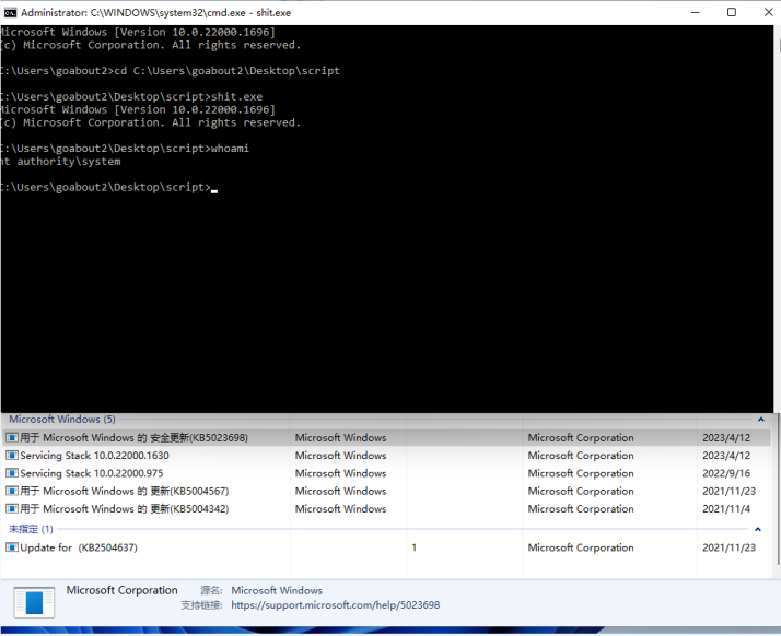 Microsoft 在四月补丁日修复该漏洞[2],并将其标记为CVE-2023-28252(Windows 通用日志文件系统驱动程序特权提升漏洞)。下图是在打补丁前系统上的运行截图,通过漏洞利用完成提权。