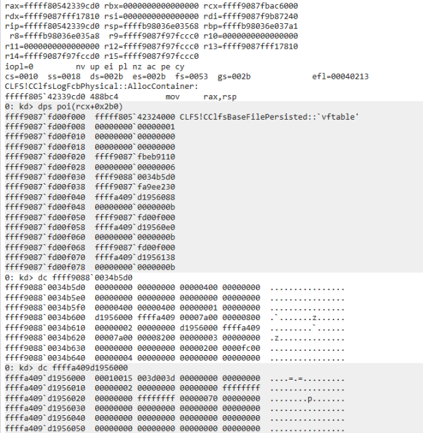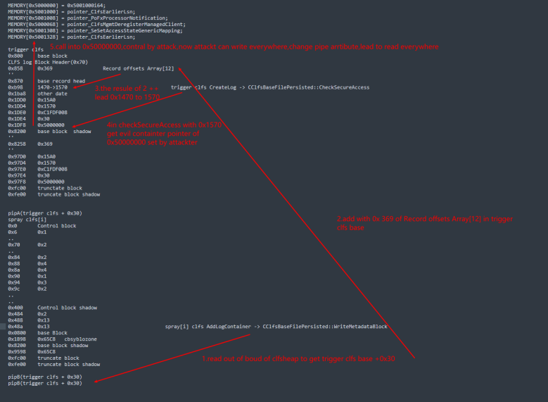 结合上述的流程,这里猜测第四步中第n个spray clfs[i]调用AddLogContainer将会导致下述内存结构中spray clfs[i]通过相邻的pipB(trigger clfs + 0x30)对trigger clfs base block内存进行破坏,从而导致之后第五步trigger clfs调用CreateLogFile时调用了错误的container pointer,该pointer指向0x500000,最终进入攻击者控制的内存中,并通过一系列辅助函数链最终达成任意地址写。