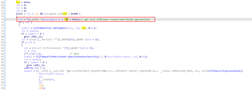 因此返回CLFS!CClfsBaseFilePersisted::CheckSecureAccess,可以看到CLFS!CClfsBaseFile::GetSymbol的第二个参数为poi(BaseLogRecord + 0xCA)。