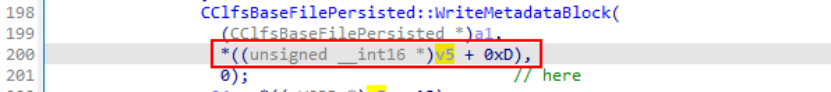其次CClfsBaseFilePersisted::WriteMetadataBlock中对返回的v9进行了判断,以防止越界取到攻击者构造的数据。