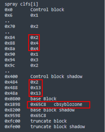 Spray clfs[i]中响应的结构如下所示,重点需要注意的位置是control block及control blok shadow两个对应的位置做了修改,control blok shadow中被修改为了0x13,此外base block中的cbsyblozone被设置为0x65c8,其对应的base block位置保持一致。