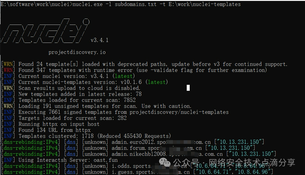 //-l subdomains.txt 加载域名文件 -t E:\work\nuclei-templates 加载上面下载的漏洞模版 即可开始检测