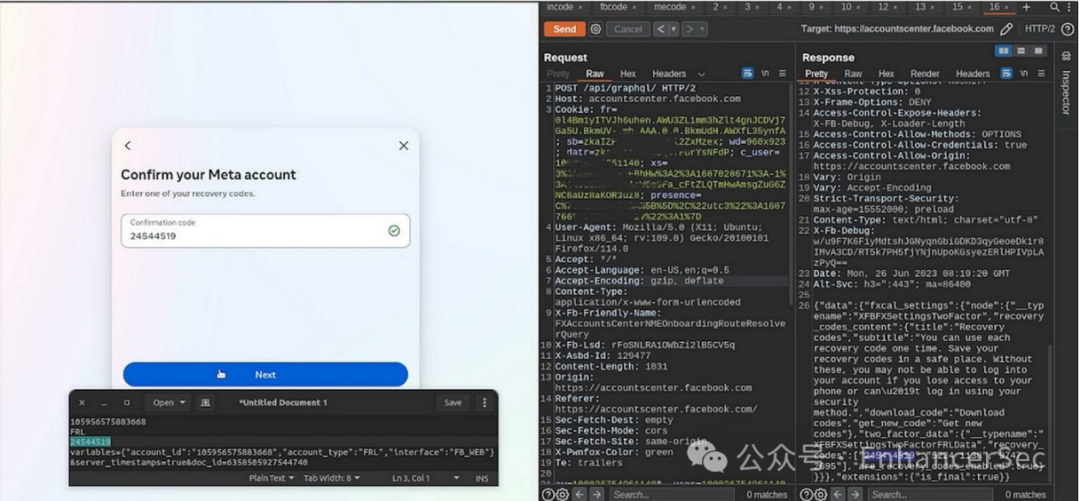 新标签页飞速跳转到Meta账户中心,小c在Burp Suite中截获FXAccountsCenterTwoFactorRecoveryCodesDialogQuery graphql
