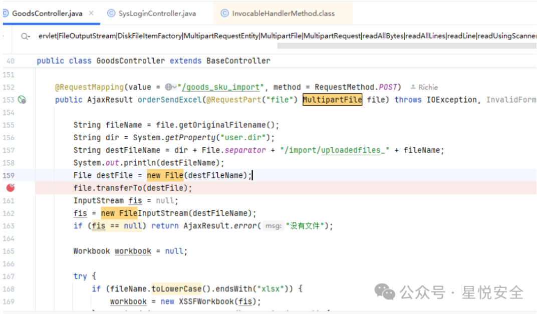 触发点位于 GoodsController.java 中 这里获取了File参数后上传,且没有做任何校验