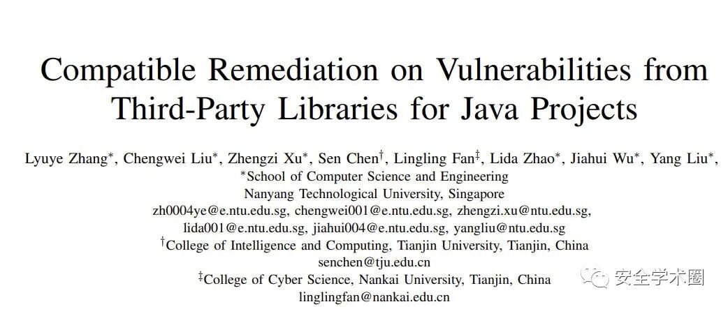 原文标题:Compatible Remediation on Vulnerabilities from Third-Party Libraries for Java Projects原文作者:Lyuye Zhang, Chengwei Liu, Zhengzi Xu, Sen Chen, Lingling Fan, Lida Zhao, Jiahui Wu, Yang Liu原文链接:https://arxiv.org/abs/2301.08434发表期刊:In Proceedings of the 45th International Conference on Software Engineering笔记作者:senu11@学术安全圈笔记小编:黄诚@学术安全圈
