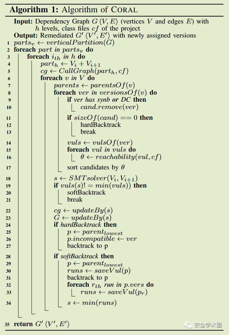 CORAL对每个子图进行优化,在版本变化兼容的条件下,使漏洞风险最小。漏洞的消除遵循方程(1)中的目标函数。