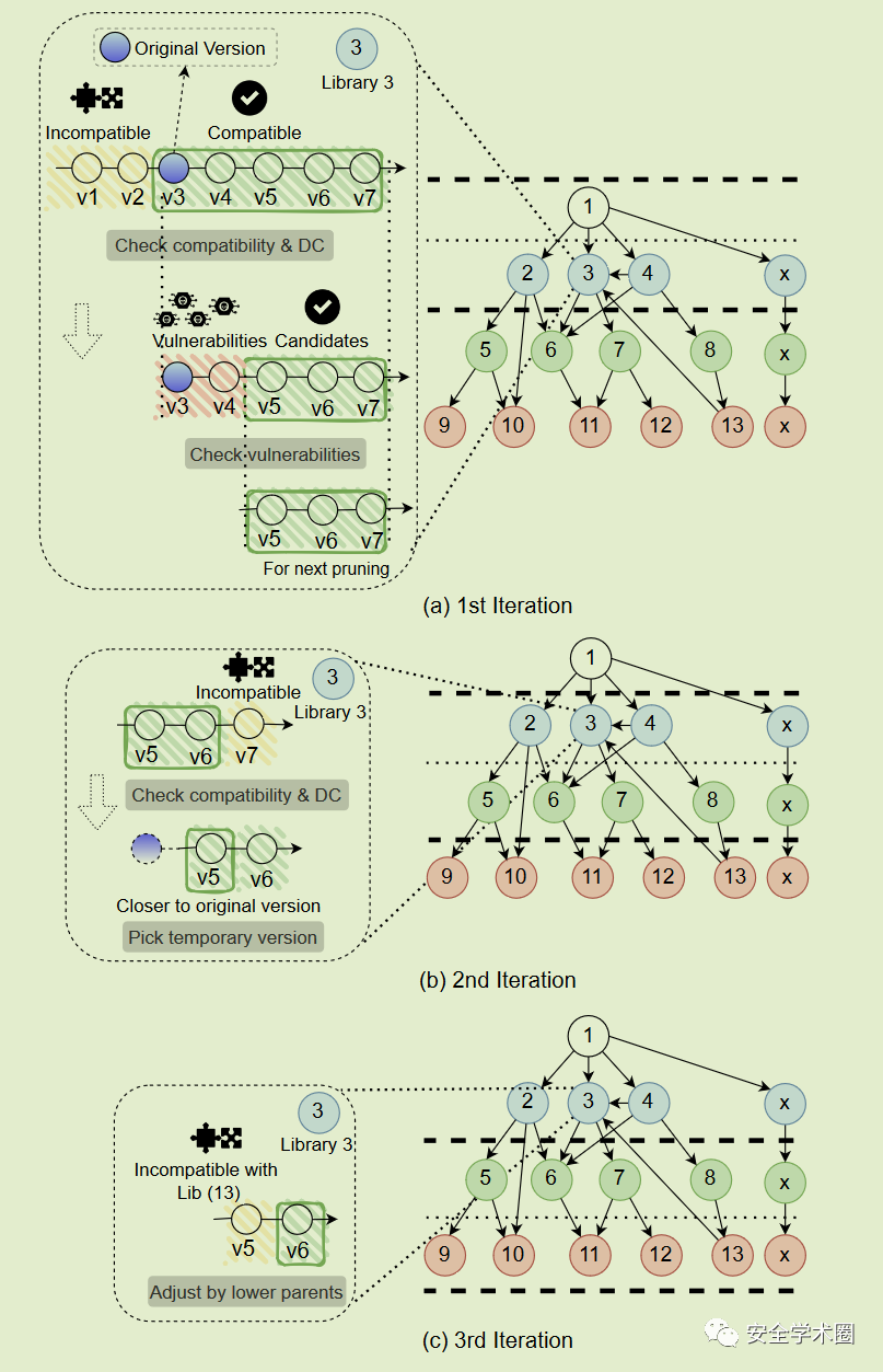 例如在图 3 (a) 中,Lib 3 最初有 7 个候选者,由于不兼容性和漏洞被过滤为 3 个;在下一次迭代 (b) 中,Lib 3 由于不兼容而将其候选者进一步过滤为 2;然后,由于与原始版本的版本跨度较小,因此选择了 v5,但是在第三次迭代(c)中,v5 被推翻,因为它与较低层级的父库 Lib 13 不兼容;由于无论层级如何,编译和Maven解析都会失败,因此选择的版本必须遵循等式(3)和(4)中的约束,因此放弃v5,选择具有兼容变化的v6。