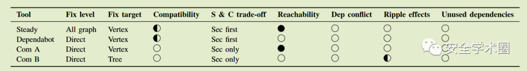 Steady 是一个开源学术 SCA 工具,带有一个开源漏洞数据库,其调整直接依赖和传递依赖的版本以细粒度降低漏洞风险。它利用漏洞的可达性分析来过滤掉低风险的无法访问的CVE,可达性包括静态和动态分析,它只在开始时构造一次调用图。Steady 优先考虑非易受攻击的版本,然后根据兼容性概率 p 去确定最佳候选者。为了推导p,它将可达的构造(类、方法等)定义为 touch points,并计算升级版本中当前 touch points 的百分比作为p。由于其不确定性,概率可能不可靠。