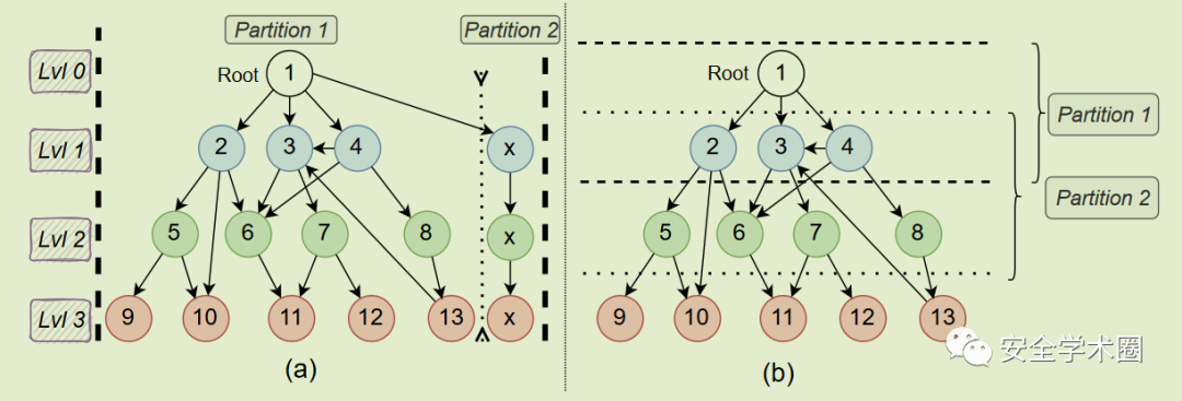 垂直分区并不能处理类似图 2 (a) 左侧的大分区的情况,水平划分可以进一步减少解空间,子图按层级(level)划分以保留语义。根据 Do stack traces help developers fix bugs,函数的语义沿着调用链衰减,即更接近根的依赖比远离根的依赖更多。依赖性由 level 标记,表示从根开始的最小跳数。