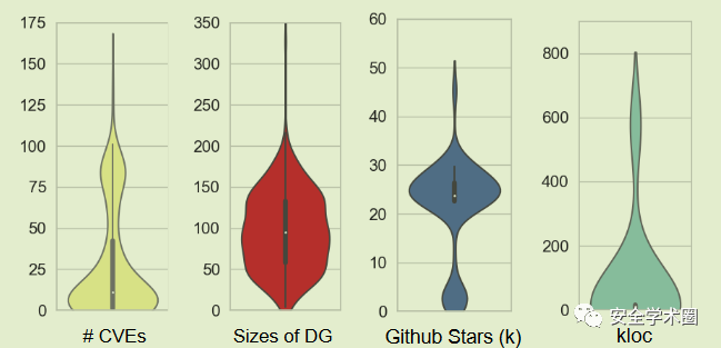 首先从 GitHub 中选择了star最多的 Java 项目,并排除了非 Maven 项目;接下来,手动修改了每个项目的 POM 文件,以应用来自这些工具的修复建议。用 1K+ star 筛选了这些项目,得到了301个入选项目。数据集的demographics如图 4 所示,具有以下特点:(1)代码库大小不小(平均 22.19 kloc);(2) 依赖图的大小范围较大(最大 327,平均 32.0);(3) 项目受到足够数量的 CVE 影响(平均 27.6);(4)项目受欢迎。