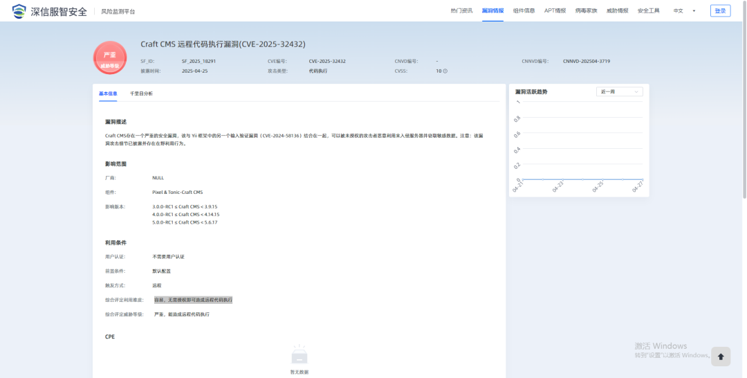 支持对Craft CMS 远程代码执行漏洞(CVE-2025-32432)的主动检测,可批量快速检出业务场景中是否存在漏洞风险