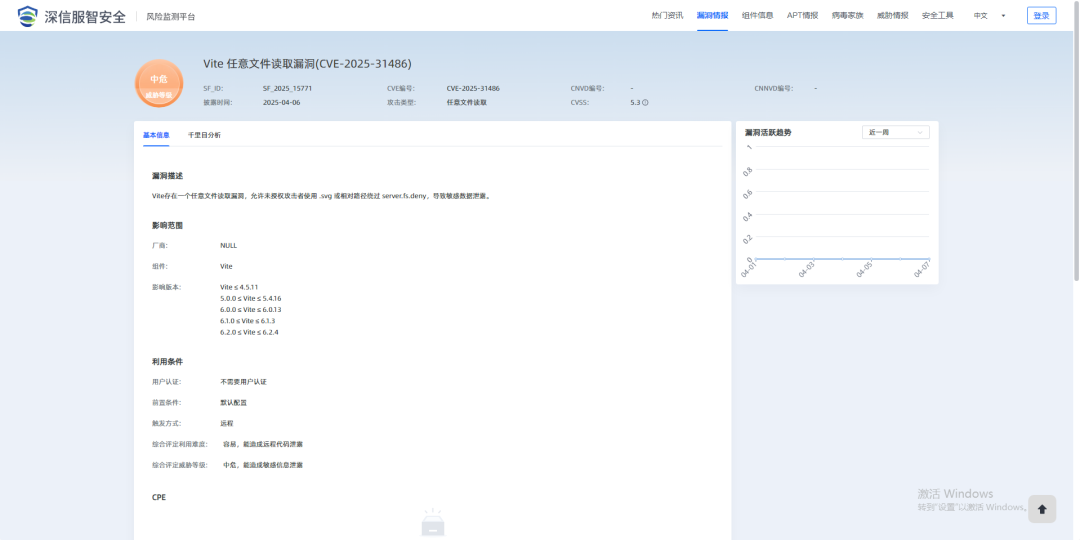 支持对Vite 任意文件读取漏洞(CVE-2025-31486)的主动检测,可批量快速检出业务场景中是否存在漏洞风险