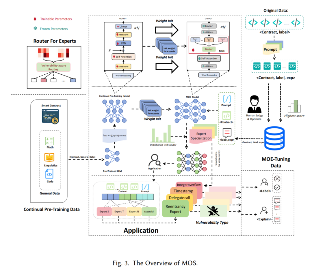 研究目的:本研究旨在解决传统漏洞检测工具在精度、覆盖面和可解释性上的瓶颈。作者基于LLaMA模型,通过持续预训练和专家网络转换,构建出一个能够精细识别漏洞类别、分析安全影响并提供人类可读解释的检测框架MOS。其最终目标是帮助开发者更早、更准确地发现智能合约中的安全问题,从而规避链上不可逆的经济损失。